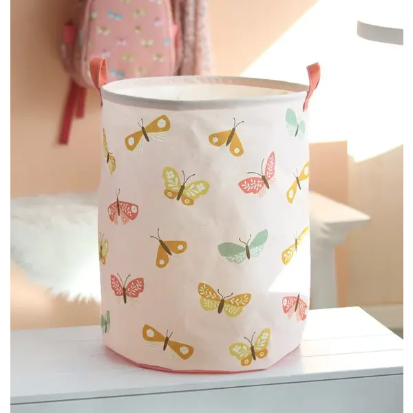 Dieser geräumige Aufbewahrungskorb aus rosa Baumwolle mit Schmetterlingen ist ideal für die Aufbewahrung von Spielzeug. Dank der PE-Beschichtung auf der Innenseite ist der Korb auch zum Sammeln von Wäsche geeignet.