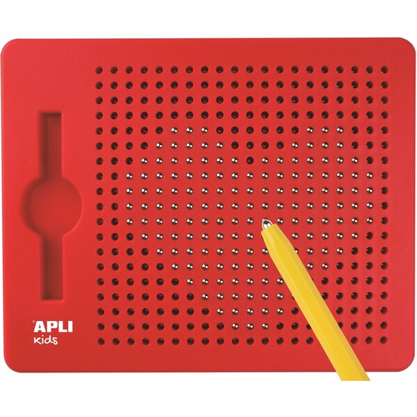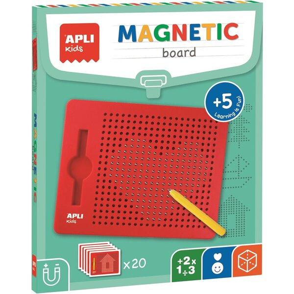 Magnettafel mit den Maßen 215 x 12 x 170 mm, in roter Farbe. Die Tafel enthält einen gelben Bleistift mit einer Metallspitze zur Verwendung auf der Tafel. Ebenfalls enthalten sind 10 Karten mit insgesamt 20 Beispielen.