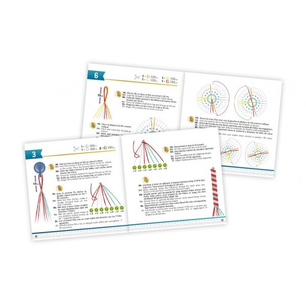 Im Lieferumfang enthalten sind verschiedene Accessoires: Baumwollgarn, gewachstes Garn, Anhänger und ein Armband aus Kunstleder.