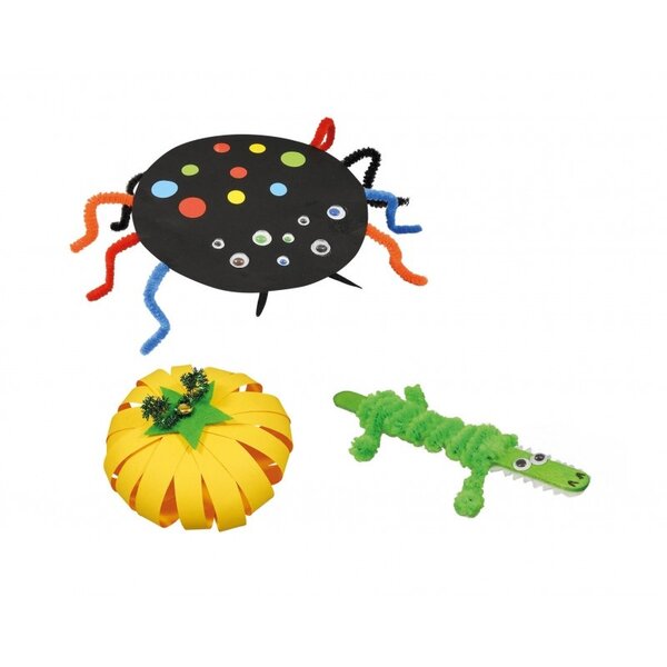 Kinder können eine Biene, eine Windmühle, ein Krokodil, ein Lesezeichen, eine Maske, eine Karte mit Pompons und vieles mehr basteln.