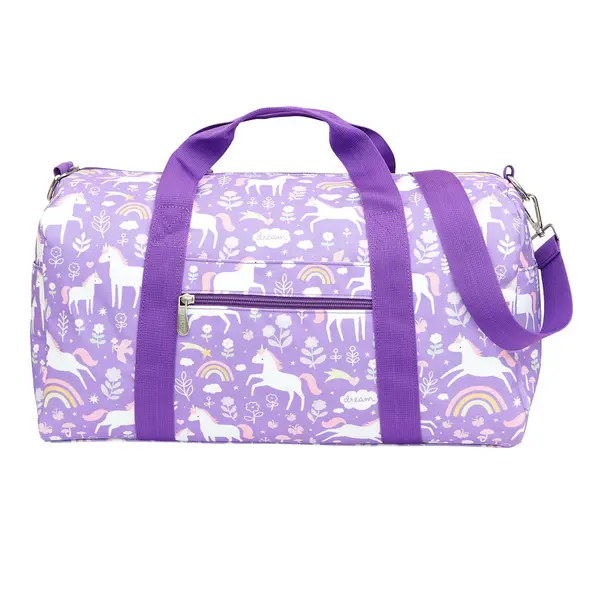 Die geräumige, violette Wochenendtasche mit Einhörnern, Blumen und Regenbögen ist ideal für den Urlaub, Übernachtungen oder als Sporttasche. Diese vielseitige Tasche hat einen doppelten Henkel und einen verstellbaren, abnehmbaren Schultergurt für optimalen Tragekomfort. Die Tasche besteht aus einem Hauptfach mit einer Innentasche, zwei Seitentaschen und einer Reißverschlusstasche auf der Vorderseite. Außerdem ist die Tasche als Handgepäck geeignet (beachten Sie immer die Richtlinien der Fluggesellschaft).