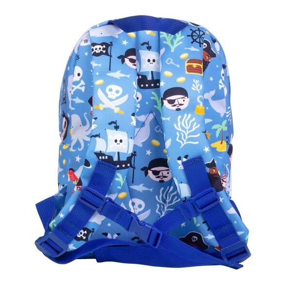 Der kleine, blaue Piratenrucksack ist ideal für die Schule oder die Kita. Der Rucksack für Kleinkinder hat ein geräumiges Hauptfach und eine Fronttasche mit Reißverschluss. Der Rucksack hat außerdem gepolsterte Schultergurte und eine Rückenplatte. Der Rucksack hat auch einen Brustgurt, damit er nicht so leicht von den Schultern fällt.