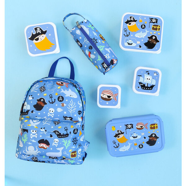 Vervollständige das Schulset mit einem passenden Piratenmäppchen, einer Brotdose und einer Trinkflasche.