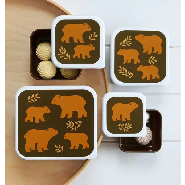 Dieses braune Lunch- und Snackbox-Set mit dem Bärendesign ist ideal für die Schule oder für unterwegs. Das Set besteht aus vier Boxen in verschiedenen Größen. So lassen sie sich leicht stapeln und zusammen aufbewahren.