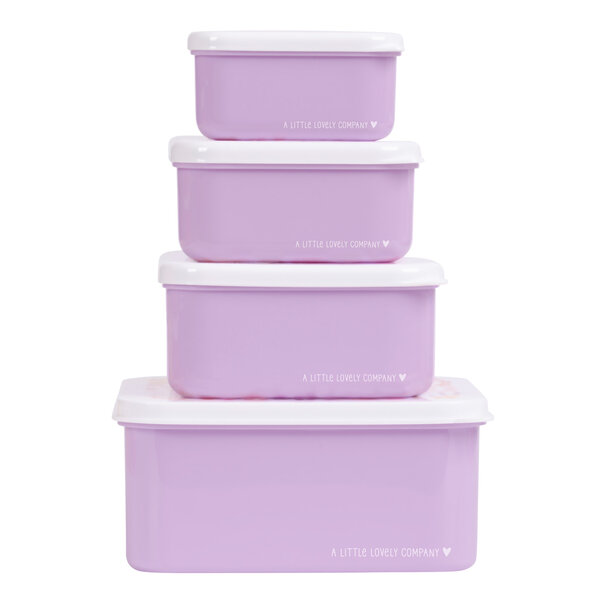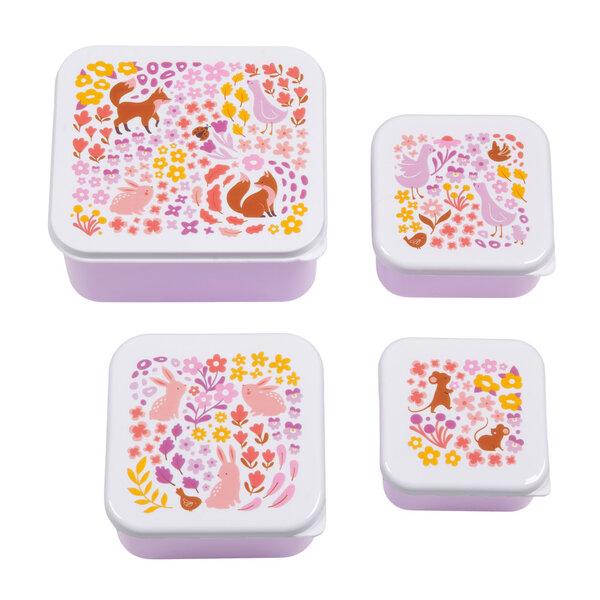 Dieses fliederfarbene Lunch- und Snackbox-Set mit Blumen und Füchsen ist ideal für die Schule oder für unterwegs. Das Set besteht aus vier Boxen in verschiedenen Größen. So lassen sie sich leicht stapeln und zusammen aufbewahren.