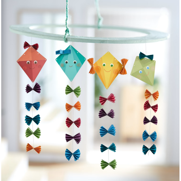 Der Wind weht und die Drachen steigen auf! Aus vorgestanzten Papierbögen entstehen vier bunte Drachen, indem man die Drachenkörper löst und die Papierstreifen zu bunten, fächerförmigen Schleifen faltet. Perfekt, um mit Kindern ab 3 Jahren das Falten zu üben. Nachdem sie zusammengebunden wurden, flattern die Drachen fröhlich im Wind und sind eine tolle Dekoration für das Kinderzimmer.