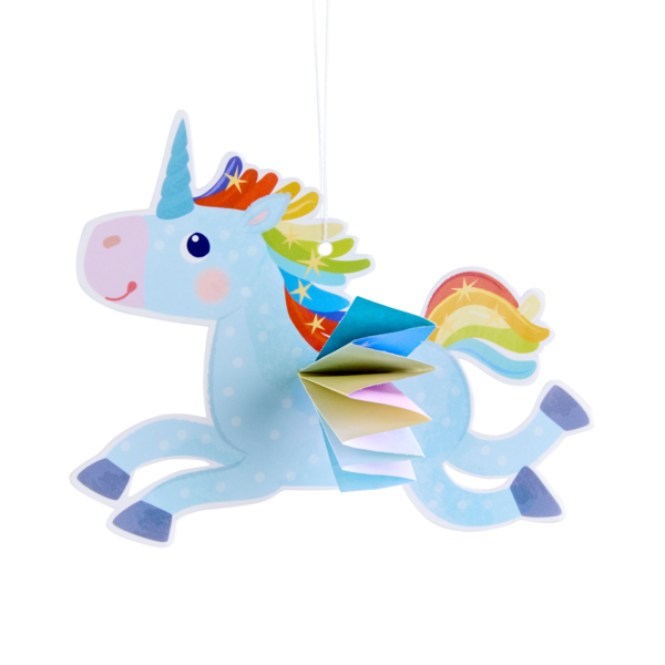 Magischer Falt-Spaß für kleine Bastler ab 3 Jahren! Mit diesem Bastelset kannst du sechs bunte Einhörner basteln, indem du die Einhornkörper aus dem vorgestanzten Papier herausnimmst und die Papierstreifen zu bunten, fächerförmigen Schleifen faltest. Perfekt, um mit Kindern das Falten zu üben. Nach dem Befestigen einer Schnur fliegen die Einhörner fröhlich herum und sind eine tolle Dekoration für das Kinderzimmer.
