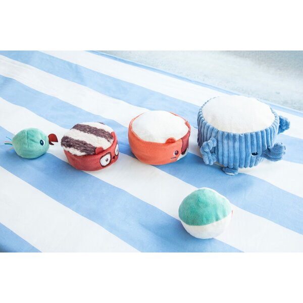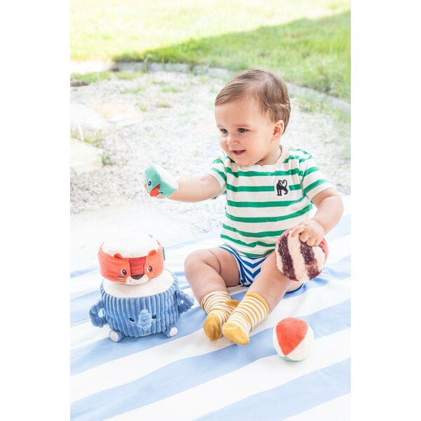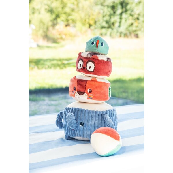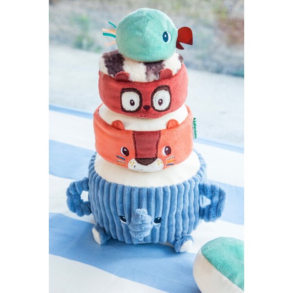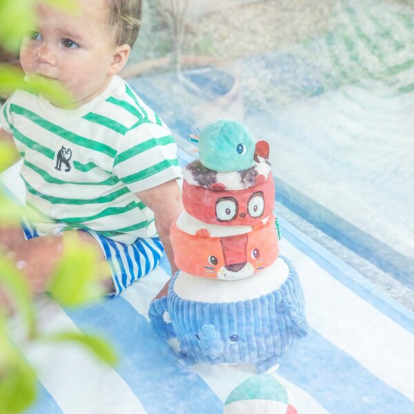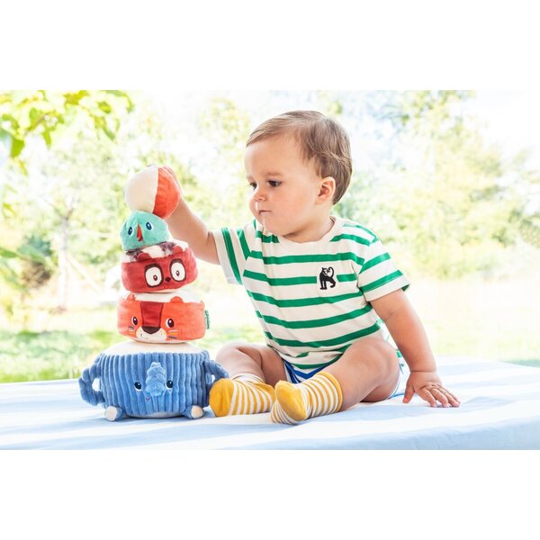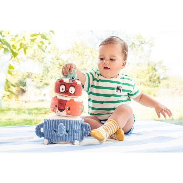 Albert, der Elefant, trägt stolz seine Dschungelfreunde: Jack, den Löwen, Elvis, den Lemur, und einen Sittich, der ganz oben sitzt. Das Baby stapelt sie nacheinander, um eine lustige Stoffpyramide zu bauen, wobei es bei jedem Schritt ein anderes Geräusch entdeckt, dem es lauschen und mit dem es spielen kann. Sobald die Pyramide steht, ist es Zeit für die lustige Herausforderung: den Stoffball so zu werfen, dass sie wackelt und zusammenfällt – unter lautem Gelächter!