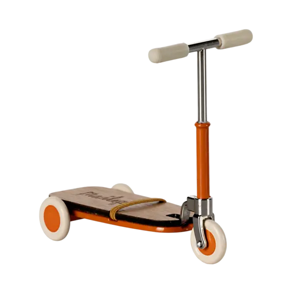 Ein Scooter mit Holzdetails. Der Roller hat einen Metallstab im Lenker, der es Mäusen mit Magneten in den Händen ermöglicht, auf dem Brett zu bleiben. Ein Gummiband ist am Brett befestigt und sorgt dafür, dass die Füße während der Fahrt auf dem Brett bleiben.