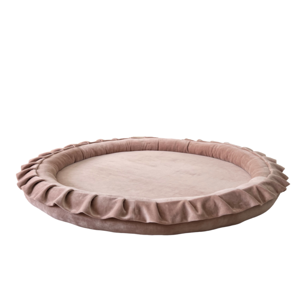 Runde Spielmatte, umhüllt von einem weichen Velours-Baumwollbezug, verziert mit eleganten Rüschen.