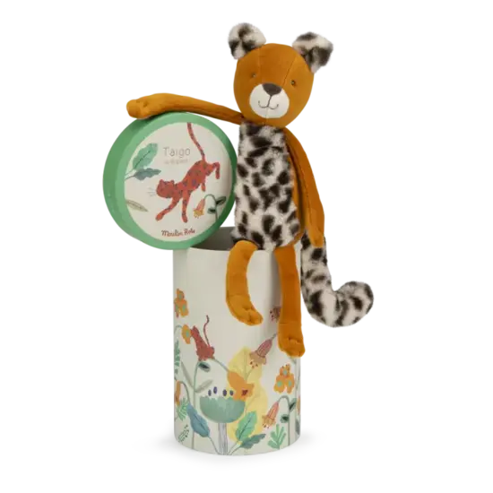 Der verspielte Leopard Taïgo möchte nur kuscheln! Mit seinem weichen, gefleckten Fell und seinem schlanken Körper passt er perfekt zu den Kleinsten. Er befindet sich in einer Schachtel, die mit Aquarellen von Élodie Coudray wunderschön illustriert ist.