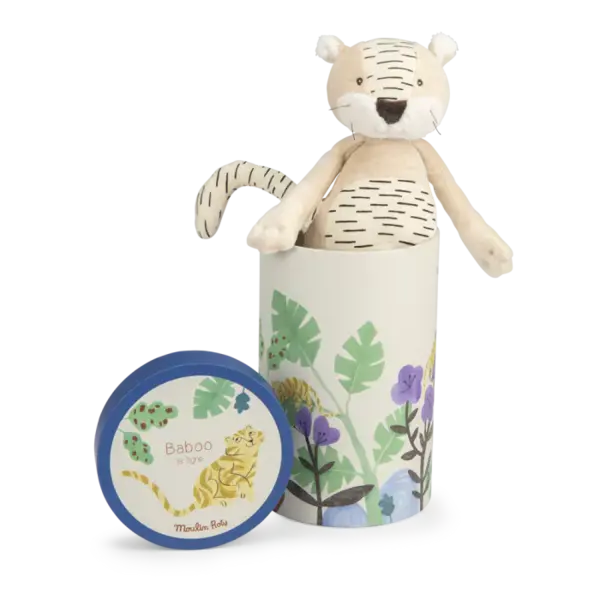 Baboo, der etwas faule Tiger, ist immer für eine Umarmung zu haben. Mit seinen runden Formen, seinem cremefarbenen Fell und seinen grafischen Streifen ist er der ideale Begleiter für Kinder. Er befindet sich in einer Schachtel, die wunderschön mit Aquarellen von Élodie Coudray illustriert ist.