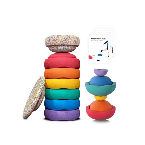 Alle Stapelstein Elemente in einem Set. Dieses Set von Stapelstein Special Super Confetti Classic All-In Set mit Super Confetti Balance Board und dem Digital Play besteht aus mehreren Sets in verschiedenen fröhlichen Farben. Diese Stapelsteine bringen Bewegung und Kreativität in den Kinderalltag. So können sie mit und auf diesen Stapelsteinen sitzen, sich bewegen, spielen, balancieren, eine Bahn bauen, darauf und darüber springen und vieles mehr ... . Stapelstein entwickelt ergebnisoffenes Spielzeug für alle Altersgruppen. Stapelstein-Stapelbausteine bestehen aus EPP, einem festen Styropor auf Polypropylenbasis. Sie werden zu 100% klimaneutral in Deutschland hergestellt und sind recycelbar.