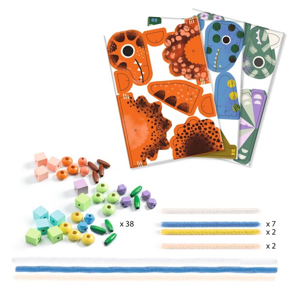 Eine originelle Aktivität, um drei niedliche und furchterregende Dinosaurier zum Leben zu erwecken! Das Kind fädelt Holzperlen und vorgestanzte Elemente aus dickem Karton auf den Chenille-Draht, um seine eigenen Modelle zu gestalten. Eine Aktivität, die die Kreativität, Feinmotorik und Fantasie anregt und unendliche Möglichkeiten bietet, die Elemente zu kombinieren und eigene Dinosaurier zu entwerfen.