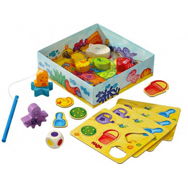 Geschicklichkeitsspiel Meine ersten Spiele – Fische angeln ist ein lustiges Kinderspiel und Angelspiel für die Kleinen. Im freien Spiel beschäftigen sich die Kinder mit der Angel, dem Meer sowie den lustigen Meeresbewohnern. Diese schwimmen munter durcheinander und finden allerhand spannende Dinge zum Spielen. Im Regelspiel ist es die Aufgabe der Kinder, einen Fisch in der entsprechenden Würfelfarbe zu angeln. Gelingt das, bekommt das Kind vom Fisch ein Spielzeug geschenkt, das es dann in seine Ablage puzzeln darf. Wer ist der beste Angler und hat als Erster alle Spielzeuge gesammelt?