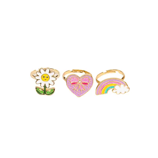 Feiern Sie das Ende des Winters stilvoll mit unserem 3-teiligen Spring Ring Flower Set. Jeder goldene Ring zeigt entweder ein Regenbogen-, Blumen- oder Herzmotiv und ist verstellbar!