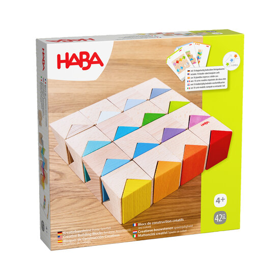 Stein für Stein ein Künstler sein! Die kreativen Bausteine Bunte Spielfalt von HABA wecken bei Kindern ab 4 Jahren die Lust am Experimentieren: Wie müssen die Holzbauklötze eingesetzt werden, um einen Turm zu bauen? Wie entstehen kunstvolle Farbreihen? Hier kann nach eigenem Ermessen experimentiert und die Schwerkraft auf die Probe gestellt werden. Die Einkerbungen in den natürlichen Bausteinen ermöglichen unterschiedlichste kreative Konstruktionen in 3 Dimensionen, darunter ein Würfel aus zwei farbigen Dreiecken und einem Baustein. Beim Spielen entwickeln Kinder ihr räumliches Vorstellungsvermögen und trainieren ihre Hand-Augen-Koordination. Wer noch etwas Inspiration braucht, findet diese in den beiliegenden Schablonenkarten in 3 Schwierigkeitsgraden.