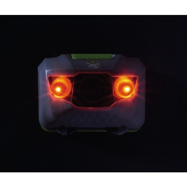 Robuste, leicht zu tragende Stirnlampe mit weißen und roten LEDs. Wahlweise mit Dauerlicht und Blinksignal. Darüber hinaus spritzwassergeschützt und mit verstellbarem Winkel. Entspricht allen geltenden Normen für Kinderlampen. Geliefert EXCL. Batterien (3x AAA). Hergestellt aus Polyester, Nylon und Kunststoff.