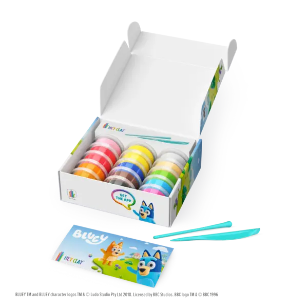 - Inhalt: 15 Dosen Modelliermasse und ein App-Zugangscode für Bluey & Friends