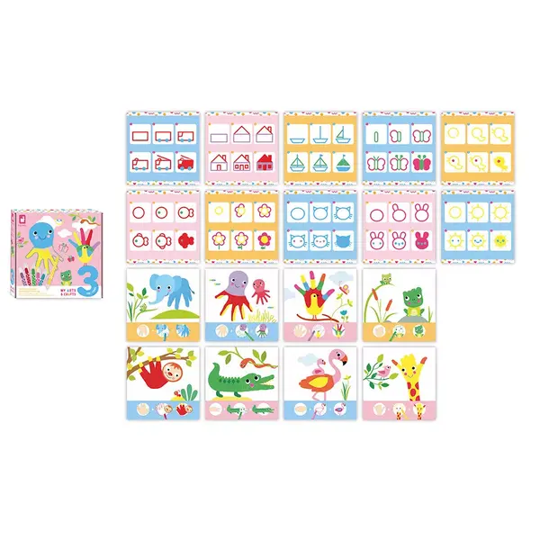 Ich lerne, meine ersten Bilder zu malen! Mit diesem Kreativ-Kit für Kinder ab 3 Jahren können schon die Kleinsten schöne Bilder malen. Das Geheimnis? Befolge die Schritte, aber benutze auch deine Hände! Mit diesem Kreativkasten kann man nämlich 10 Zeichnungen, die Schritt für Schritt erklärt werden, auf einer abwischbaren Schiefertafel reproduzieren. Wir probieren, wir fangen wieder an und wir verbessern uns! 8 teilweise illustrierte Tafeln können auch durch das Zeichnen der Umrisse der Hand oder der Finger vervollständigt werden: mit ein paar Strichen des Bleistifts entsteht eine lustige Giraffe oder ein lustiges Faultier! Dieses Set zum Zeichnenlernen ist ideal für Kinder im Vorschulalter. Auf den Bildern sind hübsche Tiere abgebildet, und die Schritte zum Nachzeichnen der Illustrationen sind genau beschrieben. Dieses kreative Hobby enthält: 6 Gelstifte, 8 Tafeln zum Ausfüllen mit den Händen, 10 Zeichnungen zum schrittweisen Nachzeichnen, 1 radierbares Brett und 1 Schwamm. Das im Set enthaltene Heft ermöglicht es, die Anweisungen und die nachzubildenden Modelle zu verfolgen. Diese manuelle Tätigkeit ist eine gute Möglichkeit für die Kleinen, mit dem Zeichnen zu beginnen, sie fördert die Konzentration und die Ruhe. Schon bald können die kleinen Künstler auch ohne Vorlagen zeichnen! Es dauert etwa 10 Minuten pro Zeichnung oder Tabelle.