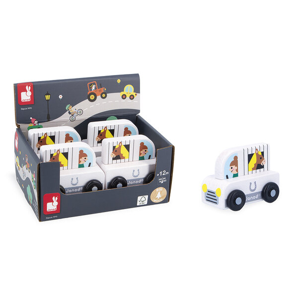 „Auf zur Pferdeshow!“ Dieses kleine Holzfahrzeug ist für Kinder ab 12 Monaten geeignet. Mit ihrem Pferdeanhänger kann die Ranchbesitzerin ihre Pferde transportieren! Die Form wurde speziell entwickelt, um den Kleinen den bestmöglichen Halt zu bieten, damit sie das Fahrzeug leicht an der Oberseite festhalten und schieben können. Die Fahrzeuge sind perfekt, um Geschichten zu erfinden und die Fantasie zu entwickeln! Babys lieben es, sie herumzurollen, während ältere Kinder sich alle möglichen Abenteuer ausdenken und so ihren Wortschatz und ihre Kreativität entwickeln. Dieses kleine Auto von Janod ist Teil der Cross Roads-Kollektion: einer Serie von Spielmatten mit Rennstrecken, die in Kombination mit den Würfelsets und kleinen Holzfahrzeugen noch mehr Spaß machen. Der Pferdeanhänger passt besonders gut zur Spielmatte „Countryside“, kann aber auch mit anderen Matten aus dem Sortiment kombiniert werden. Er ist aus Holz aus nachhaltig bewirtschafteten Wäldern hergestellt und FSC™-zertifiziert. „Wir bremsen in den Kurven!“