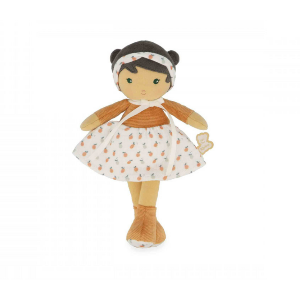 Entdecken Sie Eloise, die charmante 25 cm große Stoffpuppe mit rustikalem, sommerlichem Aussehen. Sie stammt aus der Tendresse-Puppenkollektion von Kaloo und ist für Babys ab der Geburt geeignet. Mit ihren verspielten Zöpfen verkörpert Eloise die Freude und Süße der Kindheit! Sie entführt uns in eine zarte, ländliche Welt voller Spaziergänge auf dem Land und Tagträumen unter Apfelbäumen. Eloise trägt ein hübsches gestreiftes Oberteil, das ihr einen Hauch von Eleganz verleiht. Dank der passenden Schuhe kann sie bequem in der Sonne spazieren gehen! Eloise trägt außerdem einen wunderschönen Rock aus Cord und Chiffon, der mit Fruchtmotiven verziert ist, die an die Wärme sonniger Tage und die Freude am Ernten unter der Sonne erinnern. Ein zartes Stirnband, passend zu ihrem Rock, betont ihre doppelten Zöpfe und unterstreicht ihr fröhliches und strahlendes Aussehen! Sie ist unglaublich weich und perfekt, um von kleinen Händen gehalten und geknuddelt zu werden. Eloise lässt sich leicht überallhin mitnehmen und begleitet Kinder auf ihren zärtlichsten Abenteuern. Sie ist immer bereit, alltägliche Momente zu teilen und wird zu einer echten Spielkameradin und Kuschelfreundin. Eloise erinnert an Tage auf dem Land: im Gras liegen und die Wolken beobachten und reife Früchte in der Sonne pflücken. Auf ein kleines Band, das auf ihren Rücken genäht ist, kann man den Namen des Babys schreiben, wodurch sie zu einer einzigartigen und wertvollen Freundin wird. Sie wird in einer schönen Schachtel geliefert und ist ein originelles Babygeschenk, voller Lieblichkeit und Charme. Sie eignet sich auch perfekt als erste Puppe, um die Fantasie eines Kindes anzuregen. Die Füllung besteht aus Polyester und recycelten Kunststoffperlen. Diese niedliche Puppe ist maschinenwaschbar und bereit, adoptiert und lange geliebt zu werden!