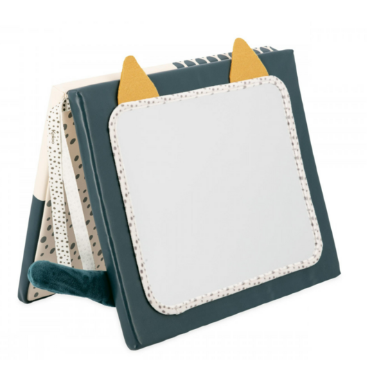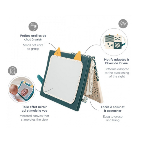 Dieser sensorische Spiegel (24 x 29 cm) wurde in Zusammenarbeit mit Psychomotoriktherapeuten entwickelt und hergestellt und ist eine großartige, unterhaltsame Möglichkeit, die Sinne von Babys zu stimulieren. Durch den Spiegel kann das Baby sein Spiegelbild sehen, was vor allem sein Sehvermögen und seine Neugierde fördert. Der Spiegel ist doppelseitig und kann aufrecht stehen. Dank der Bänder können Sie ihn überall aufhängen! Jede Seite lässt das Baby neue Dinge lernen: verschiedene Formen und Farben unterscheiden. Die Katzenohren und der Schwanz aus weichem Material helfen auch bei der Entwicklung der Greiffähigkeit und des Tastsinns des Kindes. Dieser sensorische Spiegel ist ideal für die Entwicklung der Sinne und der Neugierde des Babys.