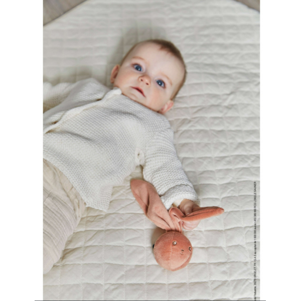 Die 5,9 cm große Terrakotta-Hasenrassel ist weich und für kleine Hände leicht zu greifen. Er enthält ein Glöckchen, das Kleinkinder beim Spielen stimulieren kann. Dank der großen Hasenohren lässt er sich leicht an einem Kinderwagen, einer Wiege, einem Stubenwagen oder einer Wickeltasche befestigen, sodass Sie ihn überallhin mitnehmen können. Dieser Ball ist unverzichtbar, um Babys von Geburt an zu unterhalten. Maschinenwaschbar bei 30 °C.
