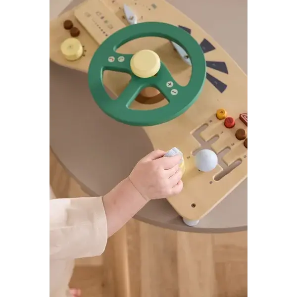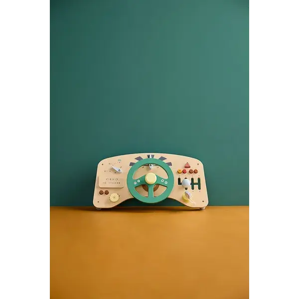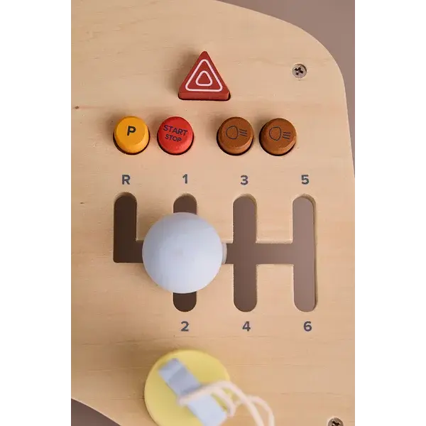 Auf die Plätze, fertig, los! Mit diesem Spielbrett aus FSC-zertifiziertem Holz kann dein Kind selbst hinter das Steuer klettern und entdecken, wie viel Spaß es macht, sein eigenes „Auto“ zu fahren. Mit einem Lenkrad zum Drehen, einem „GPS“ zum Befolgen von Anweisungen und einem Schlüssel zum Starten des Motors erwartet den kleinen Fahrer eine spannende Fahrt. Das Spielbrett verfügt außerdem über eine Hupe am Lenkrad, Druckknöpfe, einen Tachometer und eine Batterieanzeige, was für ein fesselndes Fahrerlebnis sorgt. Und da es sich um ein Elektroauto handelt, wird kein Benzin benötigt – nur jede Menge Spaß! Dieses Spielbrett ist perfekt für Kleinkinder, die entdecken, wie Dinge funktionieren, und fördert die Interaktion mit Knöpfen, Hebeln und anderen Elementen, was zur Entwicklung der frühen Koordination und Konzentration beiträgt, während sie so tun, als würden sie lenken und fahren.
