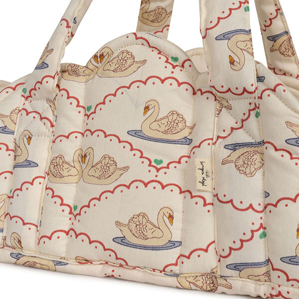 Gepolsterte Puppentrage Swan aus 100% Bio-Baumwolle. Ausgestattet mit praktischen Tragegurten, weicher Paspelierung und muschelförmigen Abschlüssen.