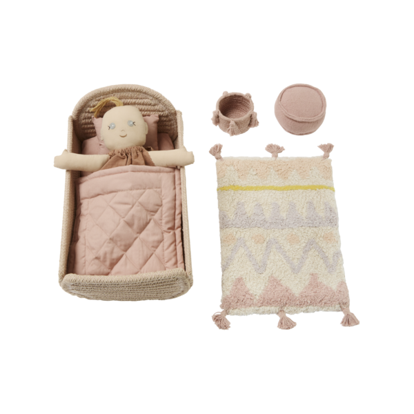 Ein textiles Spielzeugset mit einer weichen Puppe, einem Kinderbett mit Bettwäsche und passender Dekoration, bestehend aus einem Teppich, einem Hocker und einem Korb. Die Puppe und das Bettset sind aus GOTS-zertifizierter weicher Baumwollpopeline gefertigt, die Baumwollmatratze ist mit RugCycled-Fasern gefüllt, und das Kinderbett besteht aus geflochtenen Baumwollseilen, die mit Fasern aus recycelten PET-Flaschen gemischt sind. Die Dekorationsartikel sind eine Hommage an die Bestseller von Lorena Canals: Teppich Azteca, Korb Tassels und Pouf Chill. Verpackt in einem recycelten Karton in Form eines Hauses, mit einer praktischen mehrfarbigen Kordel als Griff.