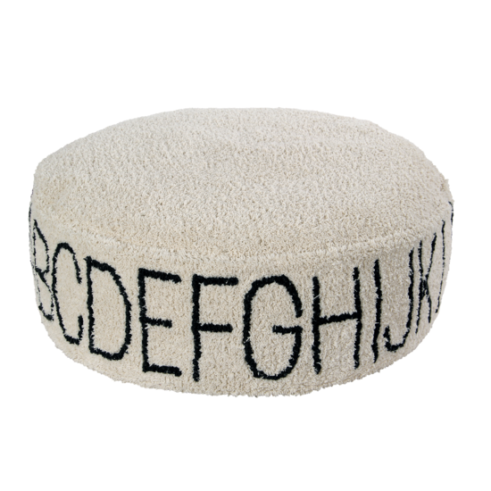Runder, breiter Sitzsack in der Grundfarbe Natur und mit den Buchstaben des Alphabets in Schwarz an der Seite. Oberseite und Seiten mit weichem Teppichflor bezogen, Unterseite aus Baumwollgewebe, mit Reißverschluss. Innen herausnehmbare Füllung mit Polystyrolperlen.