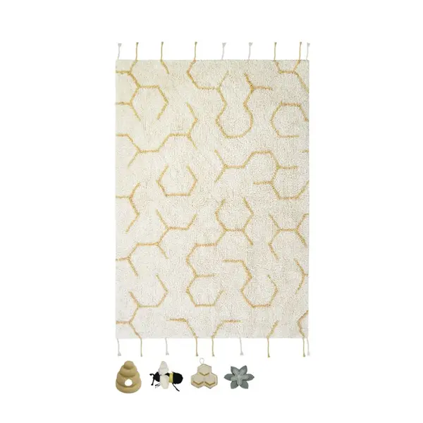Folgen Sie der Biene auf ihrer Reise von der Blume zum Bienenstock! Ein rechteckiger Spielteppich aus weichem Baumwollflor in der Farbe Elfenbein, verziert mit einem labyrinthischen Muster in hellem Honig. Der Teppich ist an den Rändern mit honigfarbenen Borten verziert und wird mit vier handgefertigten Accessoires zum Spielen geliefert: einem honigfarbenen Bienenstock aus Baumwollschnüren, einer Blume aus salbeiblauem Segeltuch, einer bedruckten Wabe aus Baumwollsegeltuch und einer süßen kleinen Biene.