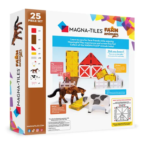 Mit das Magna Tiles Nutztiere 25-teiliges Set Magnetbausteine erleben Kinder die spannendsten Tierabenteuer. Dieses Konstruktionsspielzeug stimuliert stundenlanges fantasievolles, anleitungsfreies Spielen. Mit diese Magnetblöcke in verschiedenen Formen und leuchtenden transparenten Farben können Kinder stundenlanges inspirierendes Spiel erleben, die Chance, Strukturen ihrer Träume zu bauen. Bei dieses Konstruktionsspielzeug sind der Fantasie keine Grenzen gesetzt. Die Magna-Tiles sind langlebig und sicher, hergestellt aus lebensmittelechtem ABS-Kunststoff; frei von Phthalaten, Latex und BPA. Die Magnetblöcke halten jahrelanger Kreativität im Innen- und Außenbereich stand. Magna-Tiles bestehen aus einfach zu handhabenden 3D-Formen, die für kleine Hände konzipiert sind und sich mit einem markanten "Klick" einfach zusammenfügen lassen.