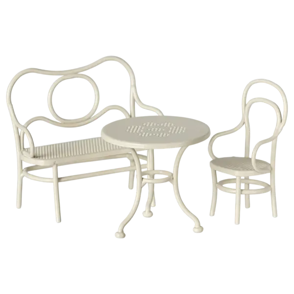 Café-Set Möbel passend zu den Mäusen Kleine Schwester/Bruder und Große Schwester/Bruder. Das Set besteht aus einer Bank, einem Stuhl und einem Tisch und ist ein perfekter Ort, um den Nachmittagssnack zu genießen.