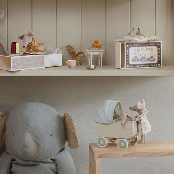 Wunderschöner Maileg Kinderwagen Micro Blue aus Metall im Vintage-Look mit Stoffbezug. Dieser Puppenwagen ist ideal für einen schönen Spaziergang mit Ihren Maileg Mäusen und Hasen. Geeignet für Maileg Mäuse und Hasen bis 13 cm.