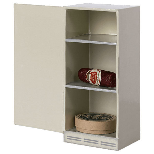 Kühlschrank Mouse rundet Ihr Maileg Haus ab. Der Kühlschrank ist aus stabilem Karton, hat mehrere Regale und eine Drehtür. In diesem Kühlschrank können Sie alle Leckereien für Ihre Maileg Mäuse und Hasen aufbewahren. Dieser Kühlschrank wird mit Käse und Wurst geliefert.