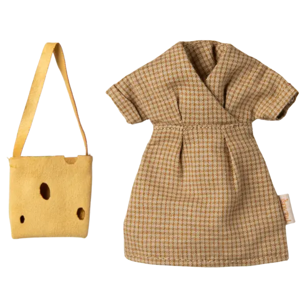 Mumienmaus in hellbraunem Körperstoff. Sie trägt ein Kleid und eine Tasche mit Löchern für Käse. Diese Maus passt Möbel und Zubehör in der Größe Maus. Kaufen Sie mehr Kleidung separat, Kleidung in der Größe Mama / Papa wird diese Maus passen.