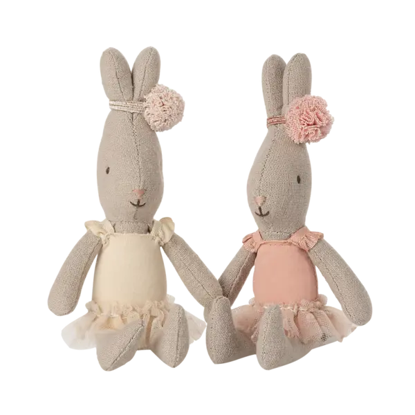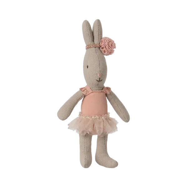 Das berühmte Maileg Mikrohäschen als Balletttänzerin verkleidet. Es trägt einen Anzug und Tüllrock und hat eine kleine Dekoration um die spitzen Ohren.