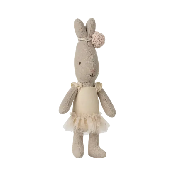 Das berühmte Maileg Mikrohäschen als Balletttänzerin verkleidet. Es trägt einen Anzug und Tüllrock und hat eine kleine Dekoration um die spitzen Ohren.