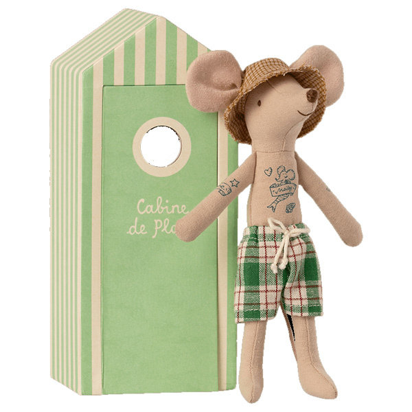 Vater Maus genießt einen Tag am Strand. In seiner Strandkabine verstaut er alle seine Strandsachen sicher. Diese süße Maileg Maus ist mit Badehose und Sonnenhut fertig!