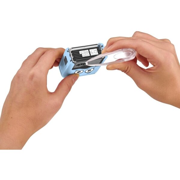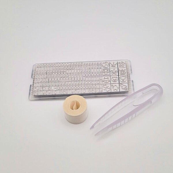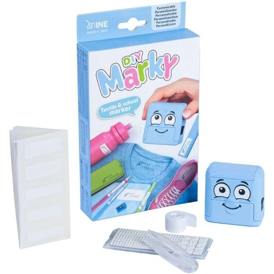 - Inhalt: 1 MARKY-Stempel, 20 Etiketten, 1 m aufbügelbares Klebeband, 1 Satz Piktogramme und Buchstaben und 1 Pinzette.