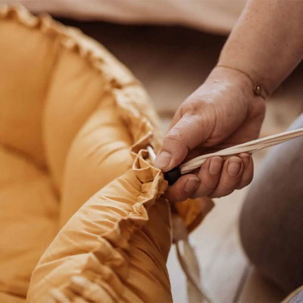 Einfach zu bedienen: Um von der Spielmatte zum Babynest oder zur Aufbewahrung zu gelangen, heben Sie die Blütenblätter an, indem Sie vorsichtig an den Schnüren ziehen. Legen Sie die Schnüre in die Tasche. Ihr Play & Go Bloom ist einsatzbereit.