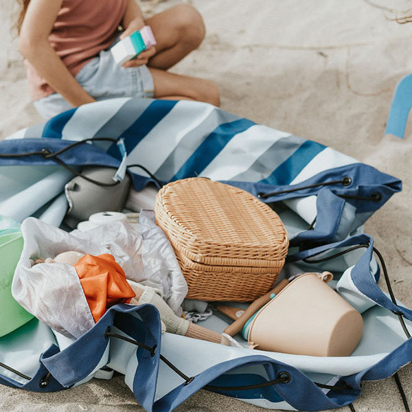 Diese Outdoor Aufbewahrungstasche und Spielmatte in 1, mit schönem Blue/Green Stripes Print, ist die einzigartige, wasserdichte Lösung, um all Ihre Sachen für einen Tag am Strand, Park oder Picknick mitzunehmen. Öffne die Aufbewahrungstasche und verwandle sie in eine schöne Spielmatte zum Sitzen oder Spielen. Wenn der Boden nass ist, bleiben Sie auf jeden Fall trocken. Zeit zu gehen? Ziehen Sie das Seil und alles ist ordentlich in einer praktischen Aufbewahrungstasche aufbewahrt. Der verstellbare Schultergurt erleichtert das Tragen der Aufbewahrungstasche. Die Spielmatte hat einen Durchmesser von bis zu 140 cm und besteht aus hochwertigem PU-laminiertem Polycotton.