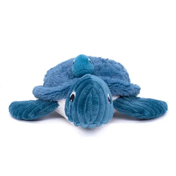 Die 29 cm große Schildkröte und ihr blaues Baby sind aus geripptem Samt gefertigt und sehr weich.