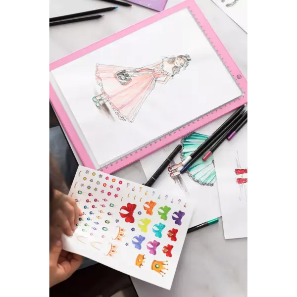 Dieser komplette Styling-Workshop lässt jungen Designern freien Lauf für ihre Fantasie. Mit dem praktischen Leuchttablett und einem umfangreichen Set an Accessoires können Kinder mühelos die schönsten, trendigsten Outfits entwerfen und zeichnen. Mixen und kombinieren Sie Stile, experimentieren Sie mit Details und kreieren Sie einzigartige Looks – genau wie ein echter Modedesigner.