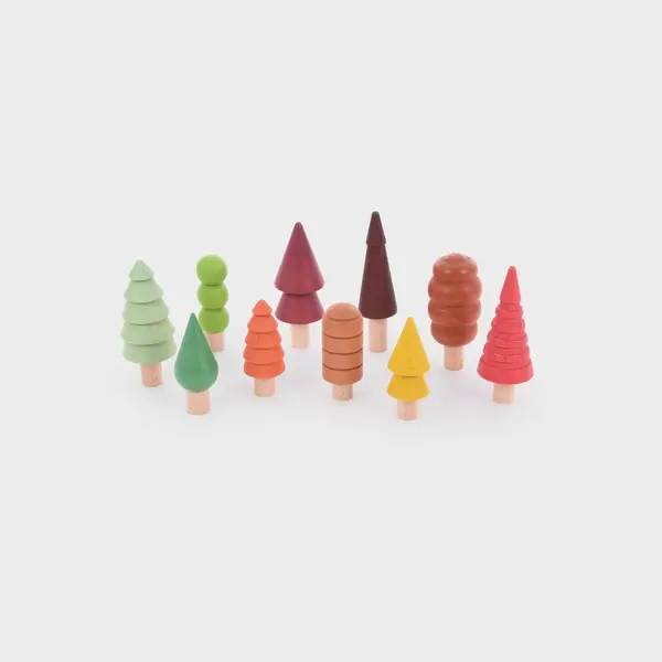 • Das Set enthält: 10 bunte Holzbäume mit einer Baumwolltasche mit Kordelzug.
