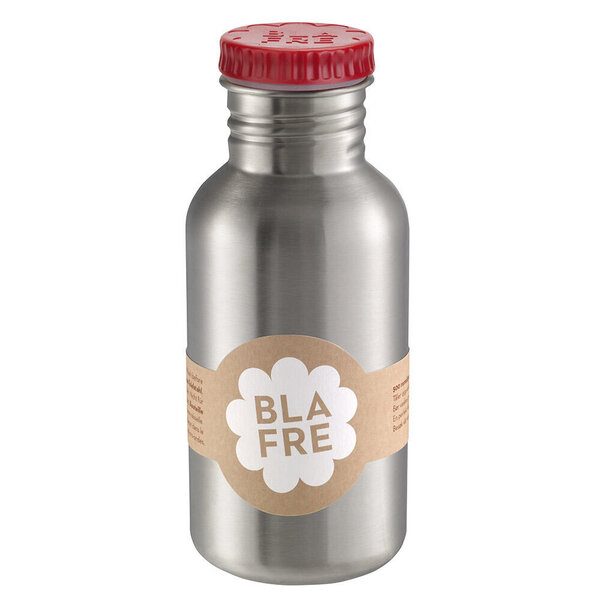 Kleine Trinkflasche in Edelstahl, mit einer Inhalt von 500 ml und eine rot-farbigen Drehverschluss. Diese praktische Trinkflasche ist leicht zu öffnen, zu schließen und leckt nicht. Die Trinkflasche kann in die Spülmaschine gestellt werden.