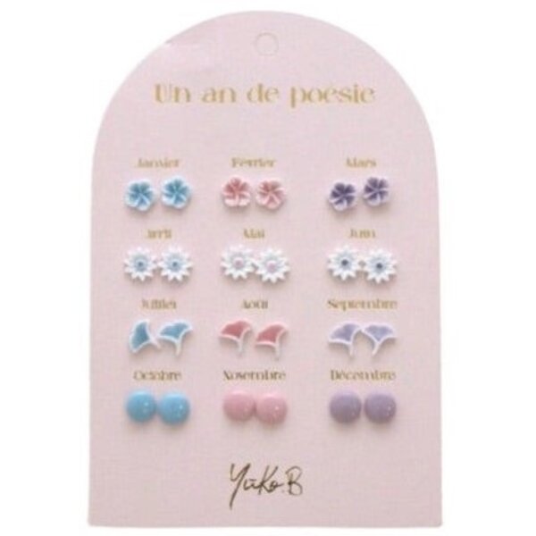 12 Paar Keramik- und Edelstahlohrringe, ein Paar pro Monat des Jahres. Jedes Set wird in einem schönen Geschenkumschlag geliefert.