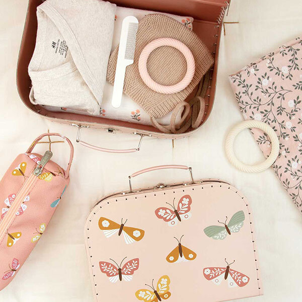 Suitcase set butterflies is a set of two cardboard suitcases in different sizes with a nice design. The cases are fun to play with and handy to store toys. In addition, the kids suitcases are beautiful as decoration in the baby or kids room. Finished with a metal handle and closure. Nice to give as a gift.